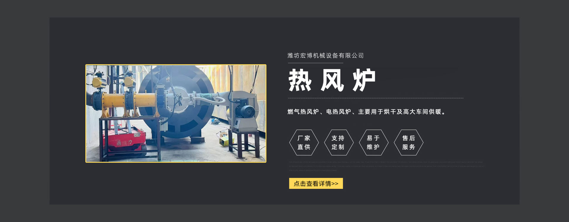 濰坊宏博機(jī)械設(shè)備有限公司是從事熱風(fēng)爐、烘干設(shè)備、供暖設(shè)備的研發(fā)、設(shè)計(jì)、制造和服務(wù)于一體的實(shí)體企業(yè)。長(zhǎng)期以來,企業(yè)以市場(chǎng)的發(fā)展和客戶的需求為導(dǎo)向,集多年的生產(chǎn)技術(shù)與經(jīng)驗(yàn)為一體,不斷開發(fā)和優(yōu)良產(chǎn)品。